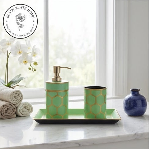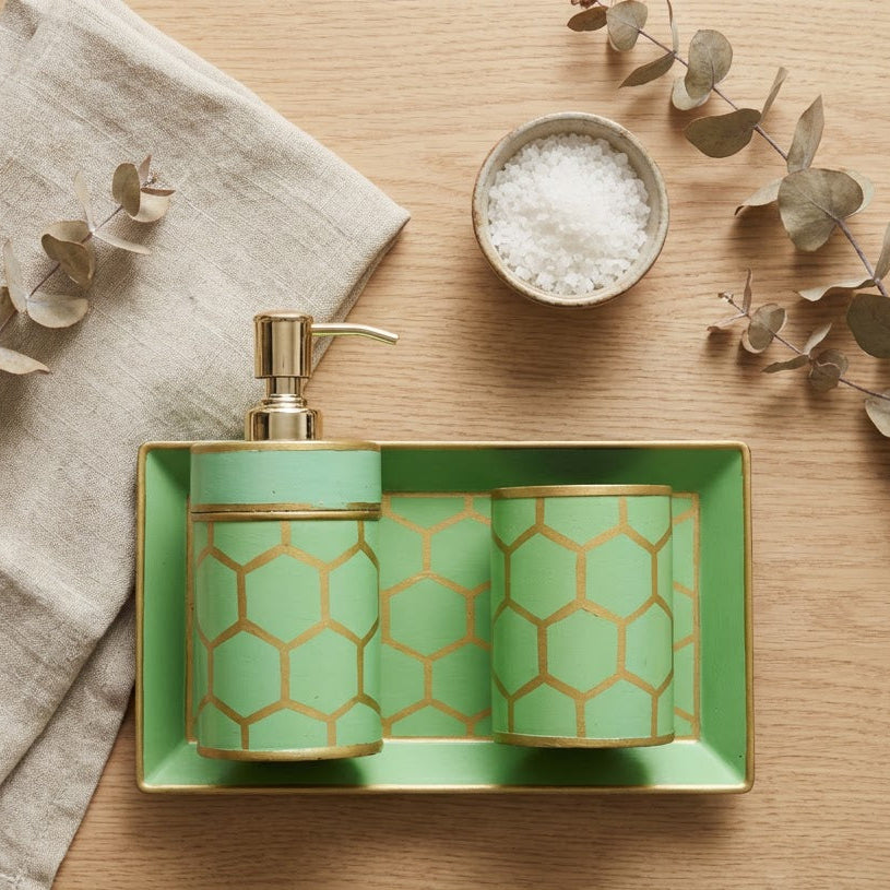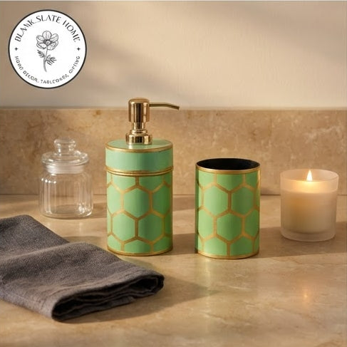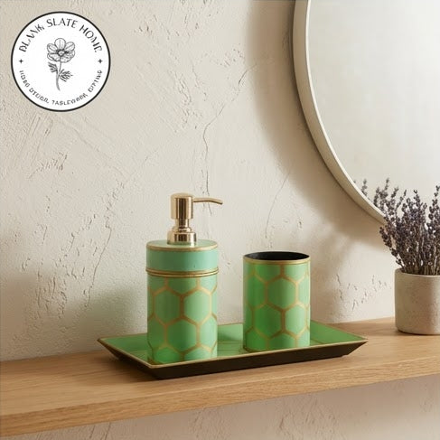 Getting ready in the mornings sure does gets easier with an organised bathroom. Clear up your washbasin space with our hand painted, one of kind keepsake bath accessories set. The set includes a soap dispenser, tooth brush holder and a tray to keep everything organised and looking beautiful. Perfect for gifting, house-warming.