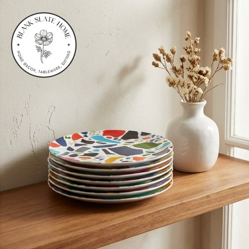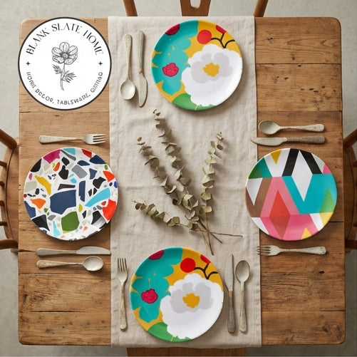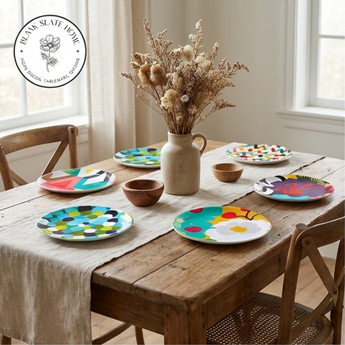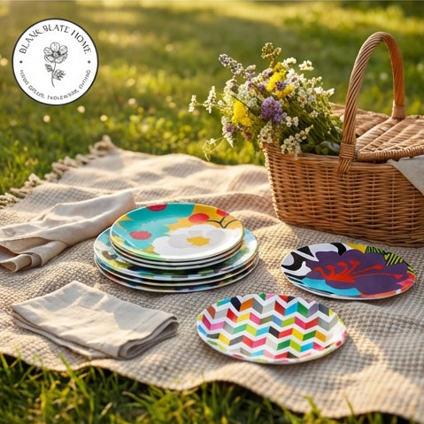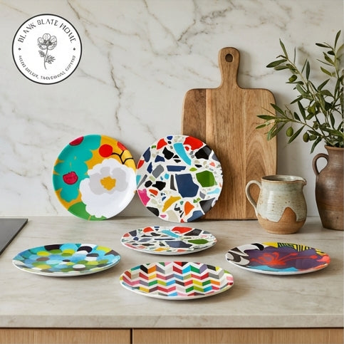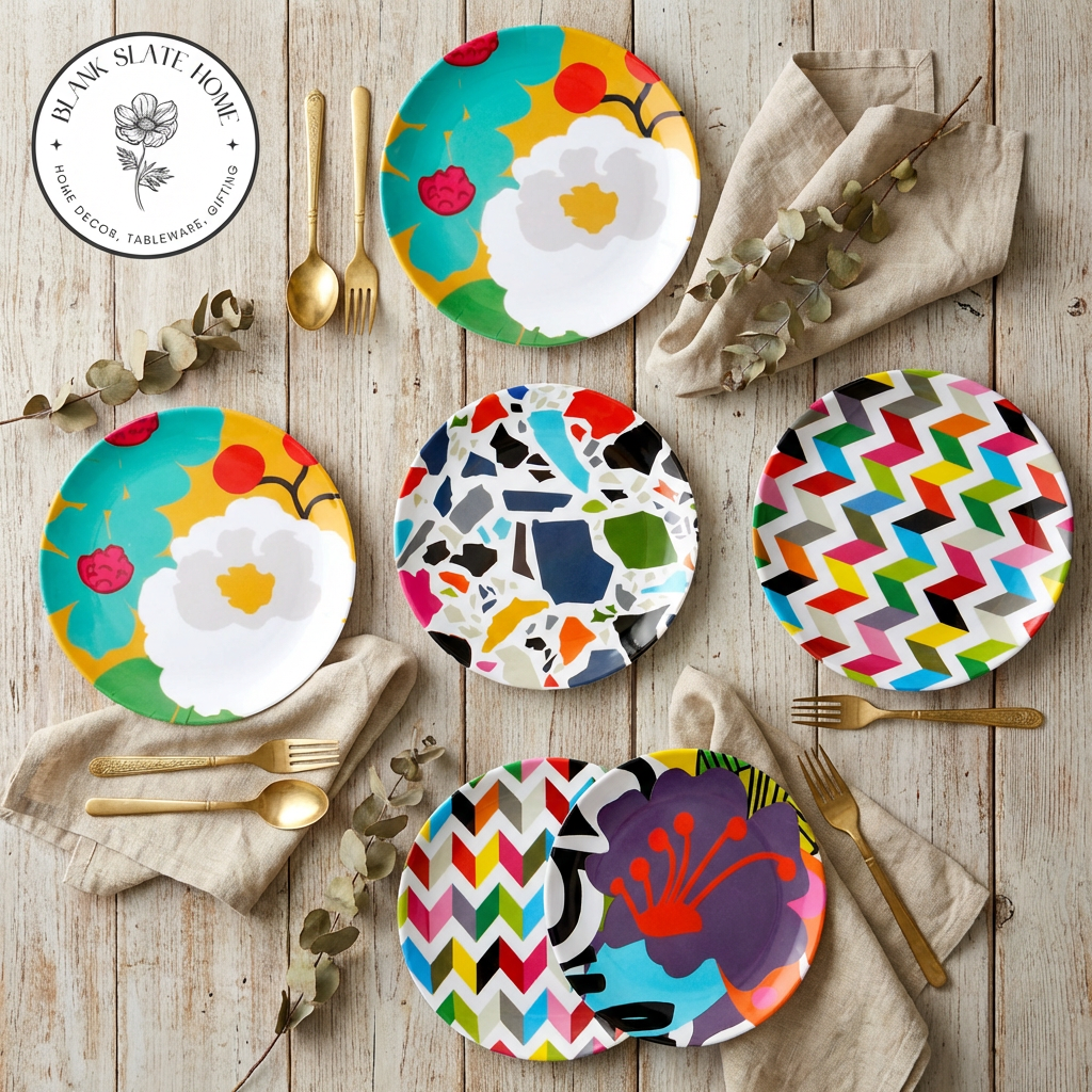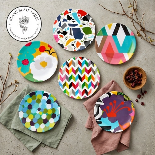 Fun set of 6 melamine appetizer plates. Sized to fit your favorite snacks and desserts, they'll make a splash in any setting. French Bull's high-grade glazed melamine 6 inch plate set is great for the home or as a gift. The scratch and shatter resistant dishes are easy to clean since they're dishwasher safe, and heat resistant to 356-degree F, 180-degree C. The durability and functionality of the material is perfect for indoor or outdoor entertaining. French Bull - reinterpreting everyday staples with a fresh, modern spin.