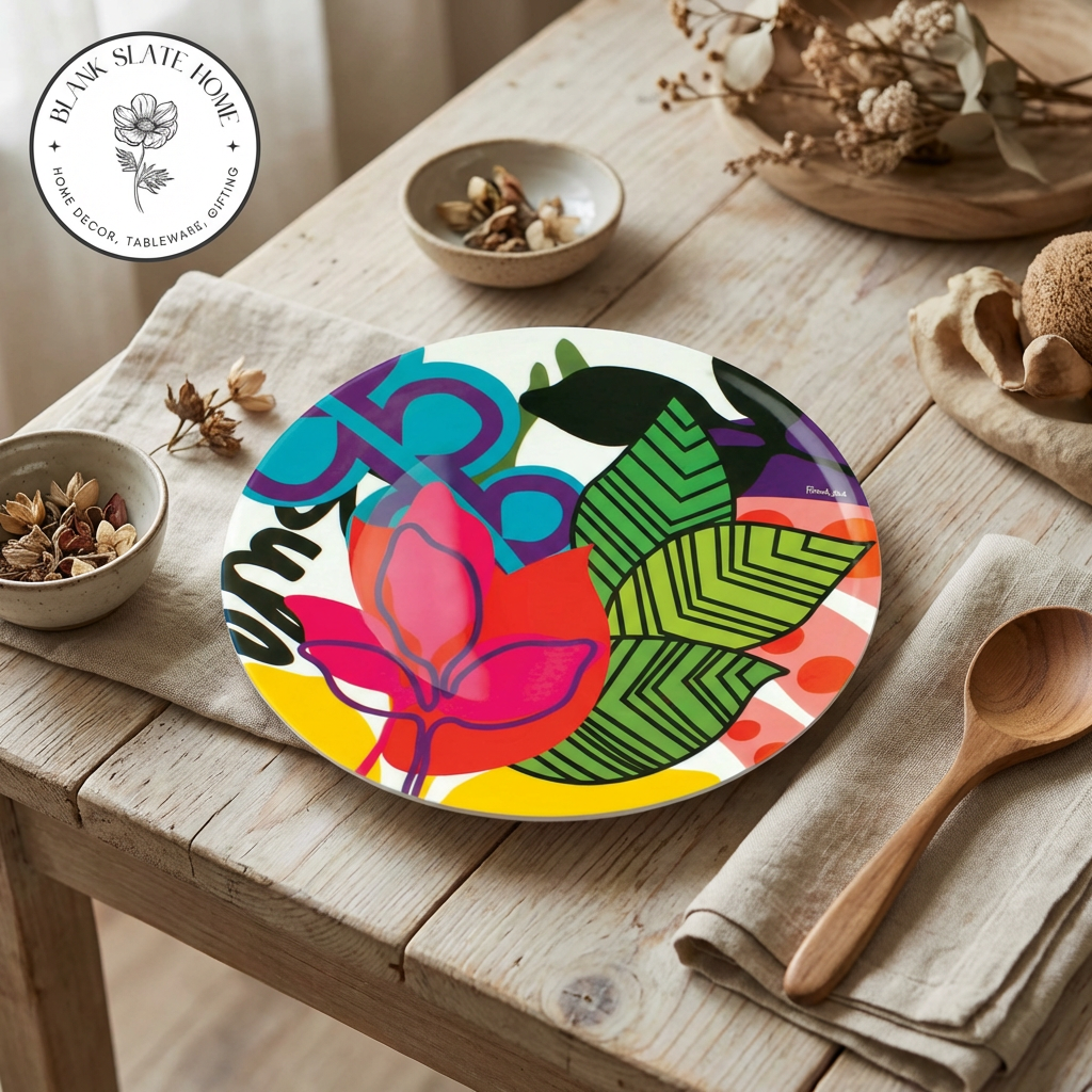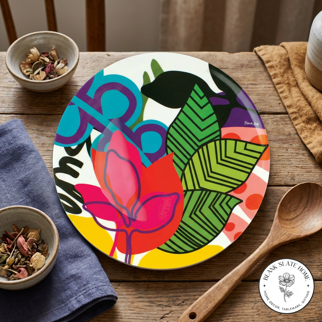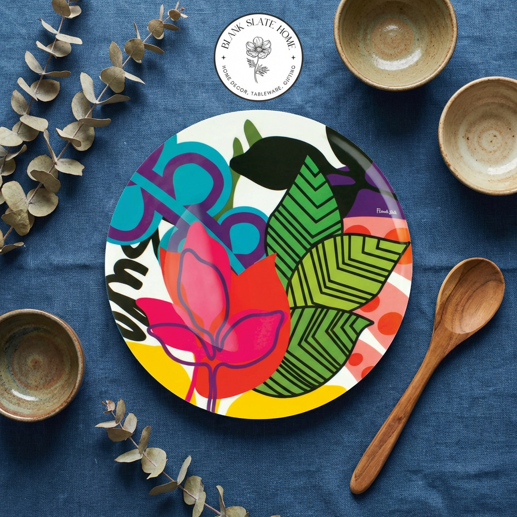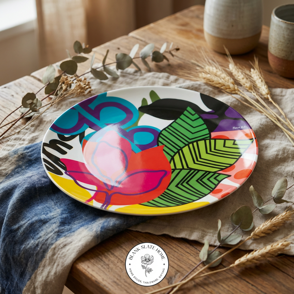 Large modern coupe-edge serving platter for indoor & outdoor meals, entertaining, picnics and barbecues. All platters coordinate with our plates to make it easy to create a unique hostess, housewarming or wedding gift. Our platters won't break, chip or fade. Round platter is great for serving your favorite foods; try it with pizza, chips and dip, dessert; the gorgeous colors are so appetizing your guests won't stop talking about it. LIVE VIVID!