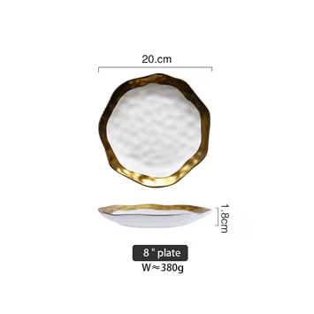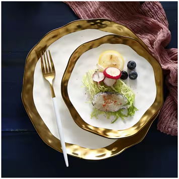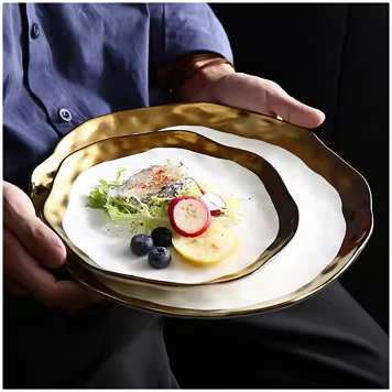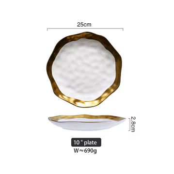 This platter, featuring a hammered design, adds elegance to any table. Crafted from gold-painted ceramic, the vintage white with gold pattern combines elegance with traditional ink art. The hand-painted gold trim adds a touch of sophistication, making this platter a versatile and glamorous choice for any occasion. Perfect for everyday use or entertaining, it also makes a lovely housewarming or birthday gift.