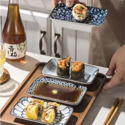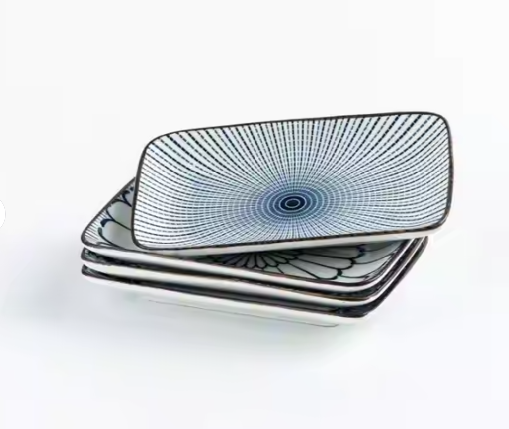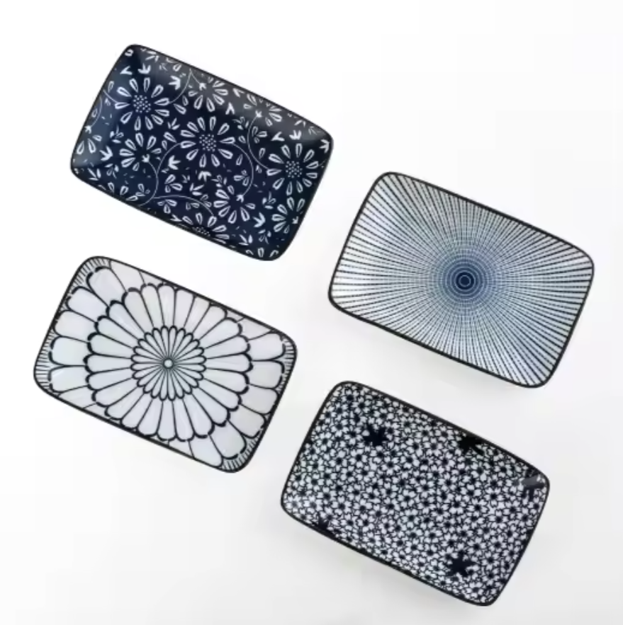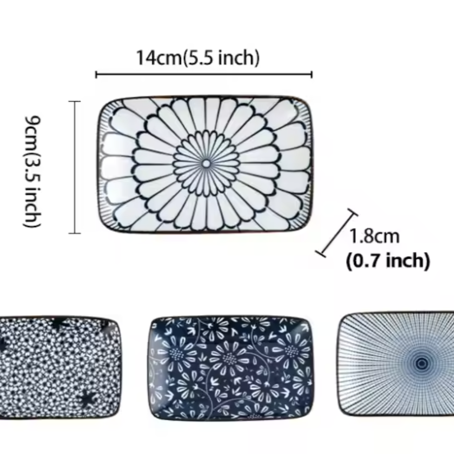 This set of four vintage blue ceramic plates features floral Japanese patterns, perfect for serving sushi, ramen, desserts, starters, or pasta.