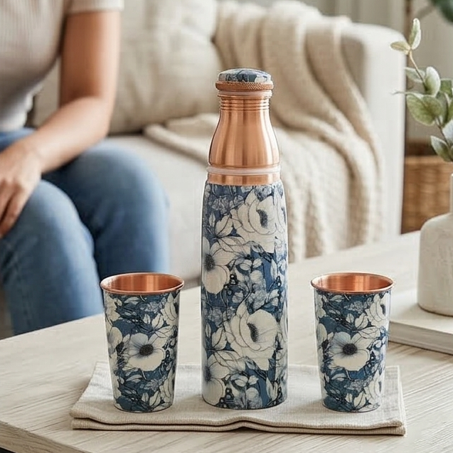 Care Instructions : Copper is meant only for drinking water. Drink water stored overnight in the copper bottle. Clean the bottle daily before filling. DO NOT expose to sunlight or direct heat. DO NOT use a hard brush on the design area. Clean inside of the bottle with a soft brush and lemon/vinegar/imli. Handle with care, wipe clean with a soft cloth. Not microwaveable or dishwasher safe.