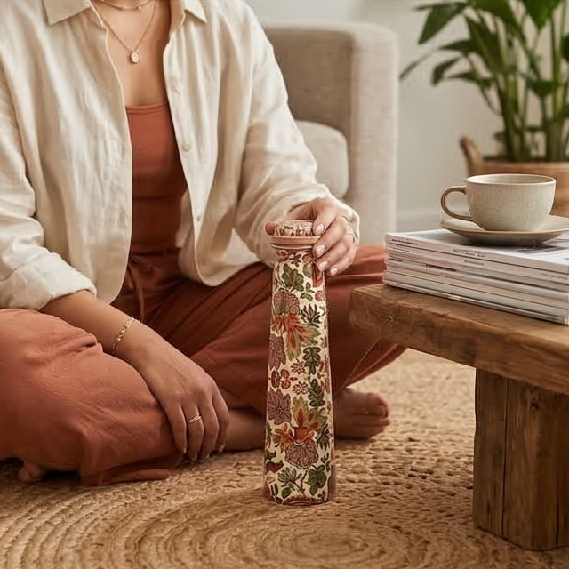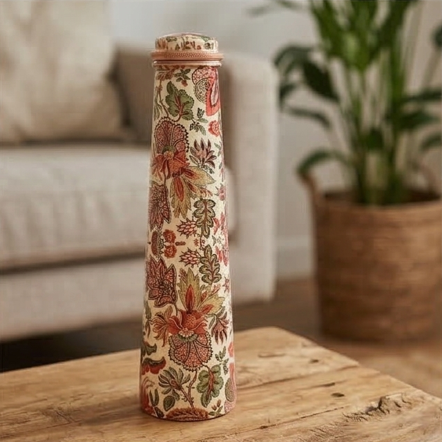 Copper is meant only for drinking water, drink water stored overnight in the copper bottle. Clean the bottle daily before filling. DO NOT expose to sunlight or direct heat. DO NOT use a hard brush on the design area. Clean inside of the bottle with a soft brush and lemon/vinegar/imli. Handle with care, wipe clean with a soft cloth. Not microwaveable or dishwasher safe.