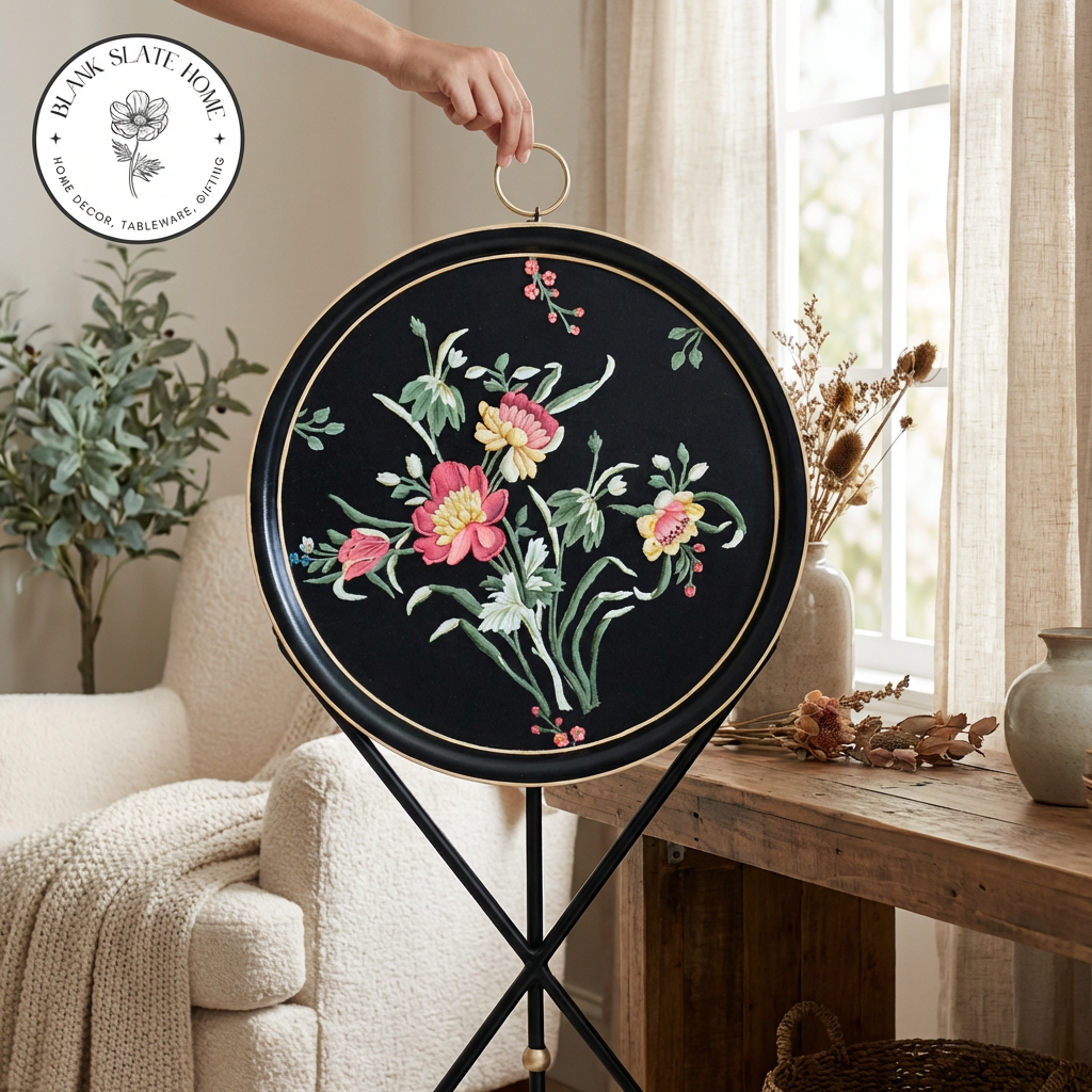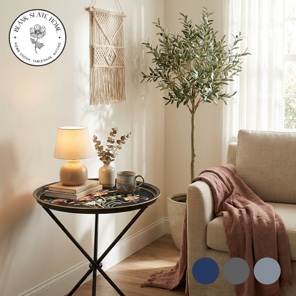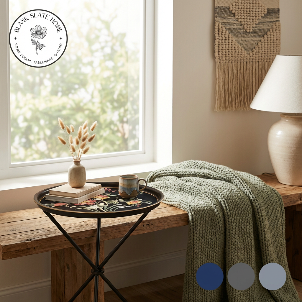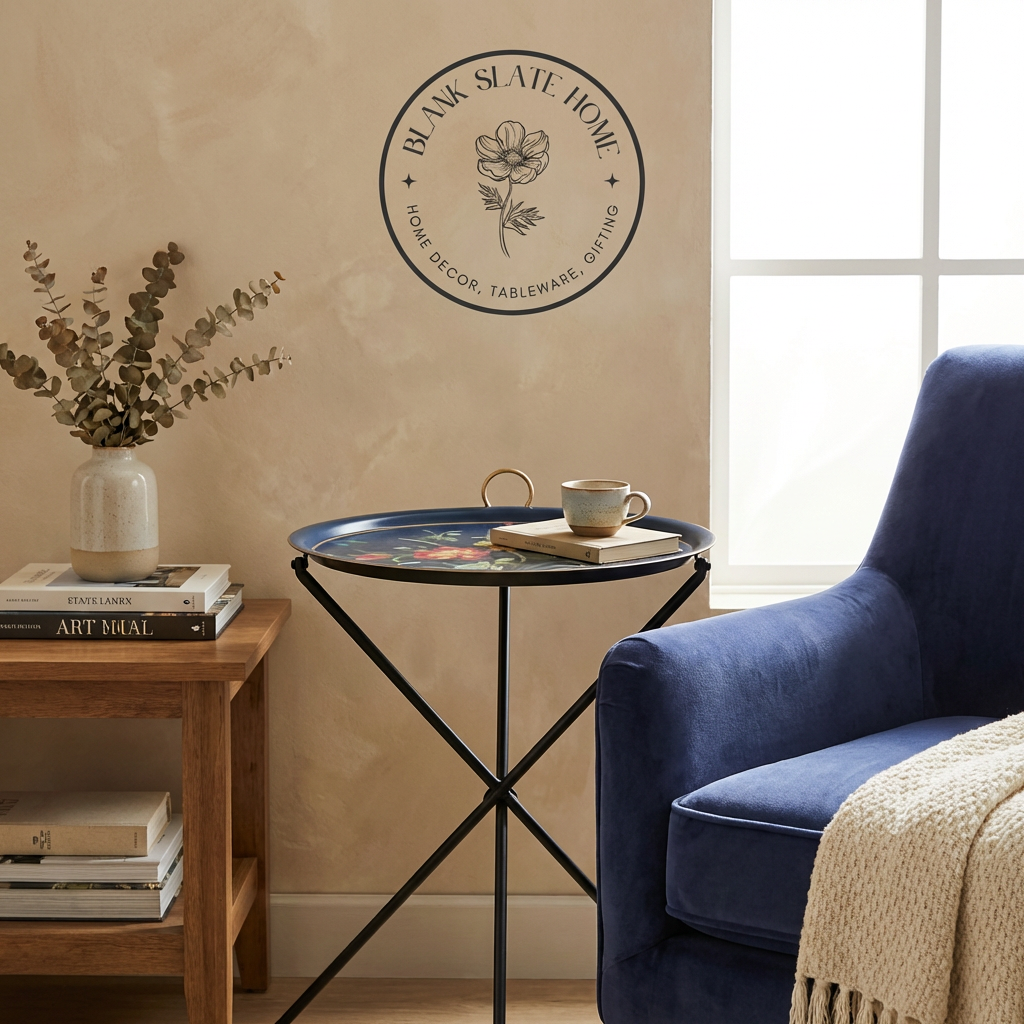 Handcrafted bespoke Blank Slate Home Foldable Metal Tray Table, hand-painted by local artisans. It has a metal tray base and rustic black iron metal legs. The Metal Tray Table is beautiful enough to display at all times or easily folded and carried if you want to carry it in and out of doors! Perfect for use as an end table in the living room or bedroom or great as a tray table in an entryway. It has a classic chic look with its solid metal construction beautiful hand-painted surface. The tabletop has one metal handles attached at the side to easily fold it with great ease.