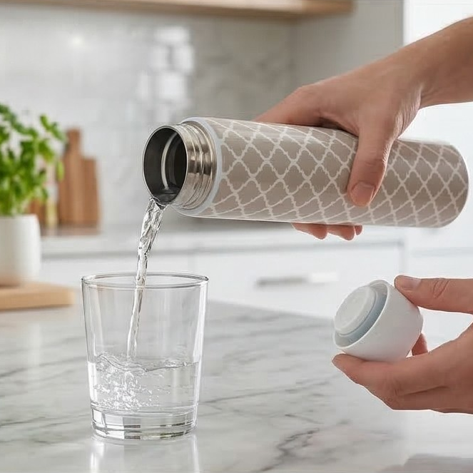 This stunning design celebrates fine craftsmanship and functionality. Made from superior construction food grade stainless steel that allows for refilling and reusing easily to reduce the need for single-use plastic water bottles. Vacuum-insulated construction, designed to keep beverages cold for up to 4 to 6 hours. Portable size is perfect for on-the-go, yoga, school or on the bedside. Slim stYle makes it easy to fit the bottle in your purse and is light weight. Fun fact: Mix and match with our signature trays to make a one of a kind set. Completely leak proof. Hand-wash only.