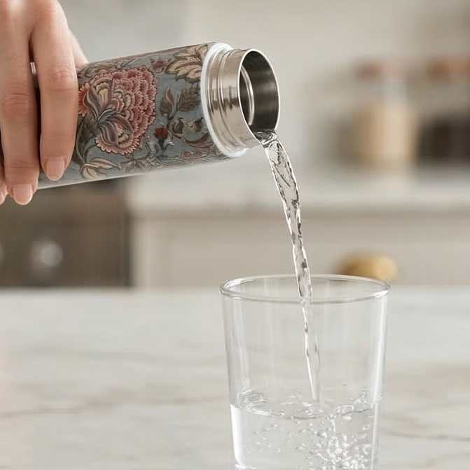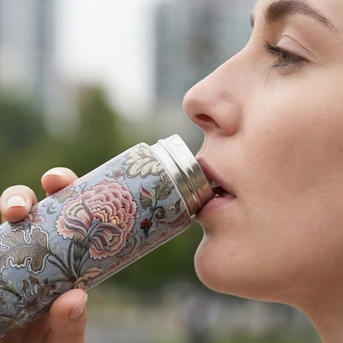 This stunning design celebrates fine craftsmanship and functionality. Made from superior construction food grade stainless steel that allows for refilling and reusing easily to reduce the need for single-use plastic water bottles. Vacuum-insulated construction, designed to keep beverages cold for up to 4 to 6 hours. Portable size is perfect for on-the-go, yoga, school or on the bedside. Slim stYle makes it easy to fit the bottle in your purse and is light weight. Fun fact: Mix and match with our signature trays to make a one of a kind set. Completely leak proof. Hand-wash only.