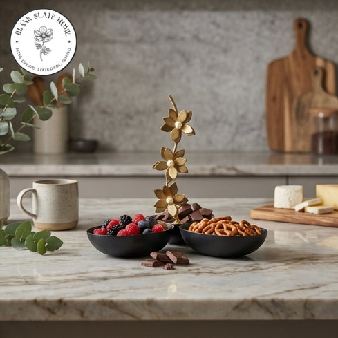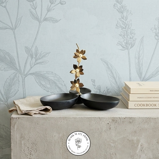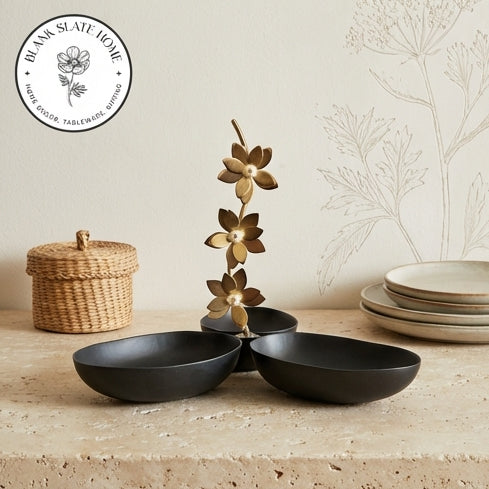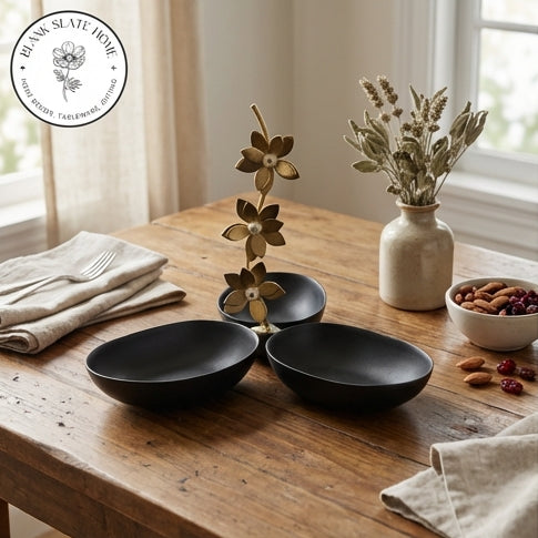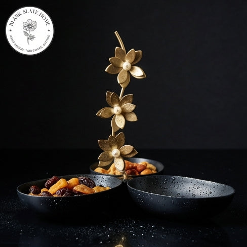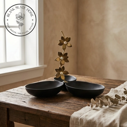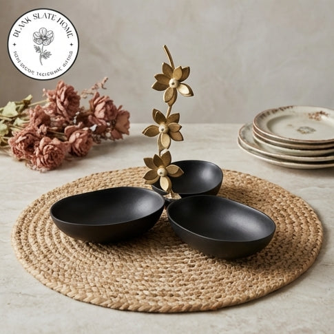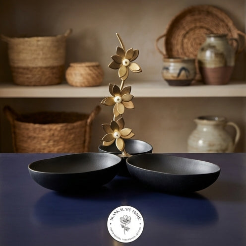 Product Description: Whether you're hosting an intimate gathering or a grand celebration, this Black 3-Bowl Serving Set effortlessly combines luxury with usability. Make a statement with your presentation, showcase an array of delicacies, and let the timeless beauty of gold leaf and pearls enhance your culinary creations.