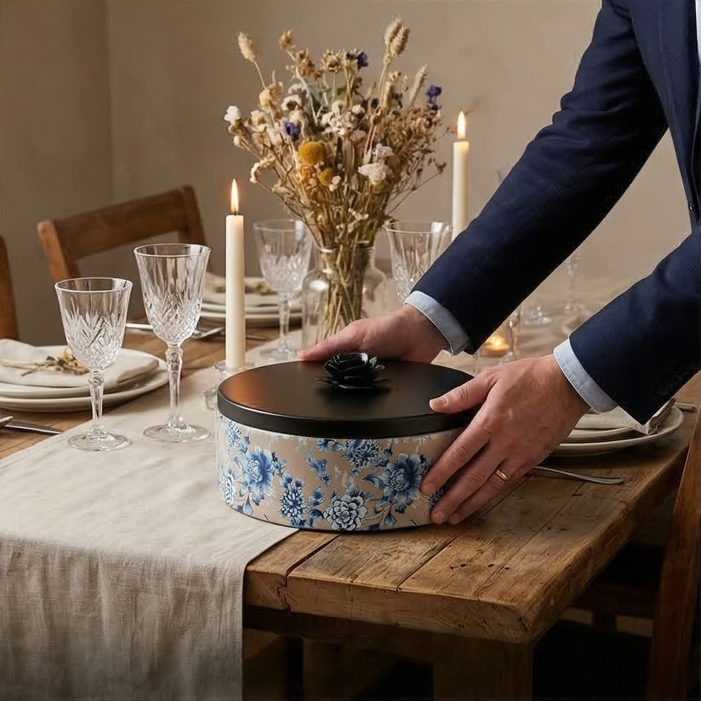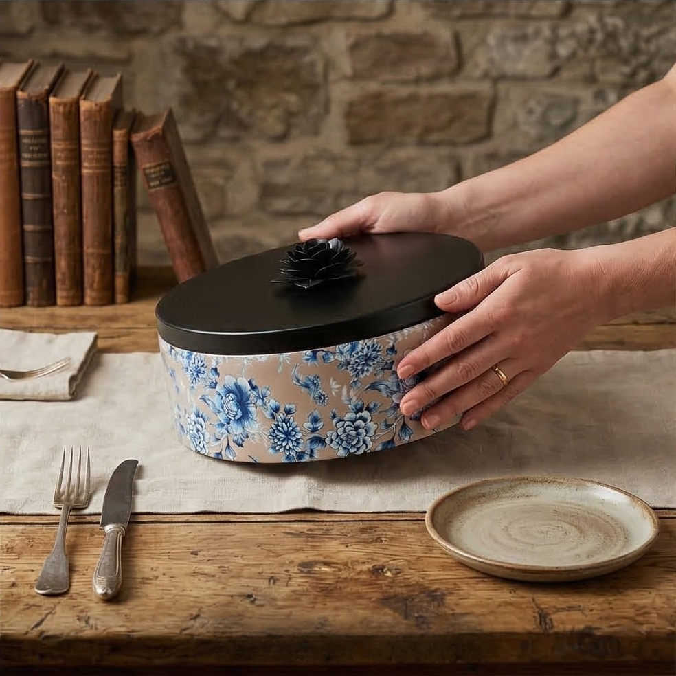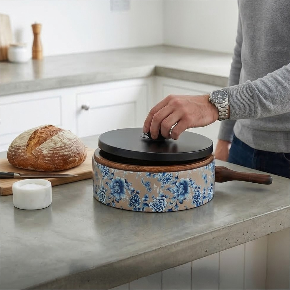 This roti box journeys your phulkas from the kitchen to your table beautifully. It’s handcrafted metal lid makes a statement and builds the look for your meals. A wooden box with a metal lid is designed with a handy ring to lift with ease. Use a cotton napkin to tuck your rotis in and keep them warm. Thanks to the handcrafted nature of these bowls, each one will be slightly different and beautifully unique.