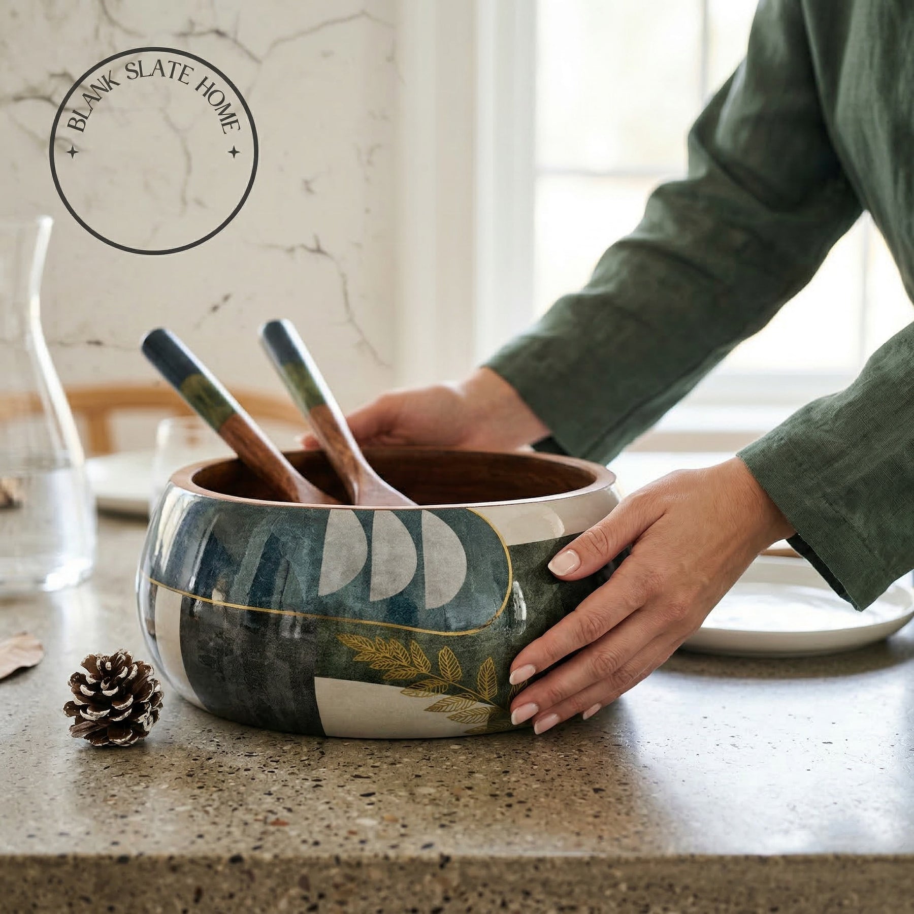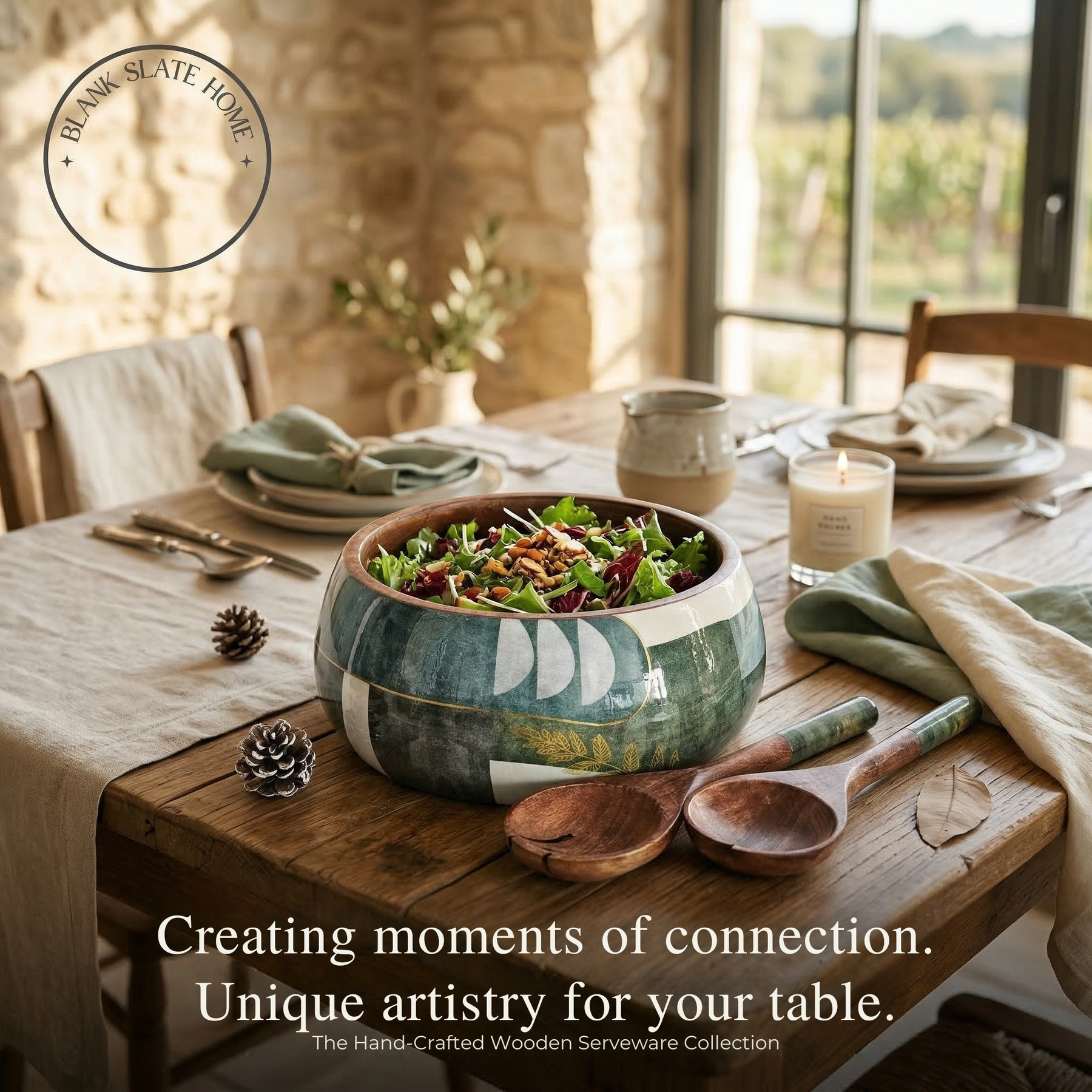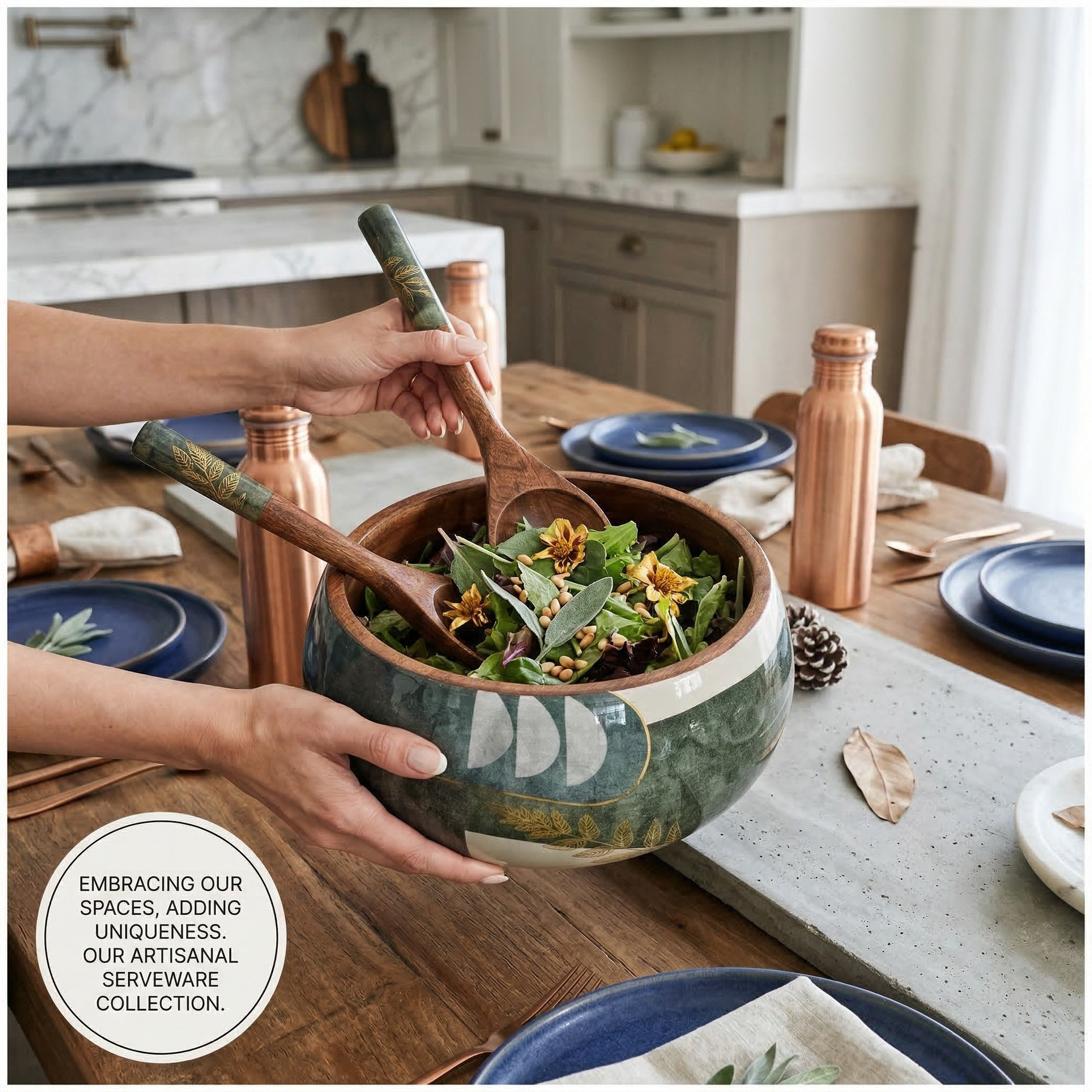 Salad Bowls round in organic curves to hold salads, snacks, fruit or collectibles. The Salad bowl is large and just the right size for serving while entertaining Paired with matching wooden serving fork and spoons. Thanks to the handcrafted nature of these bowls, each one will be slightly different and beautifully unique.