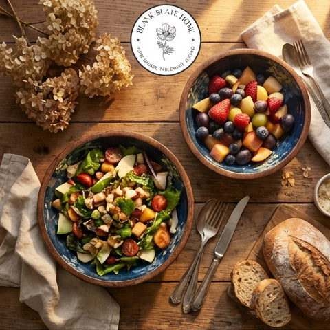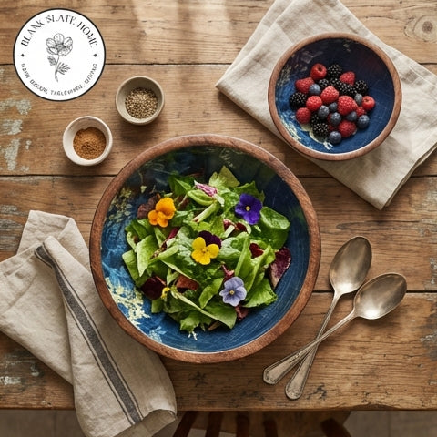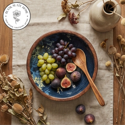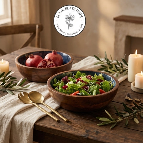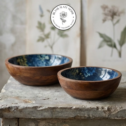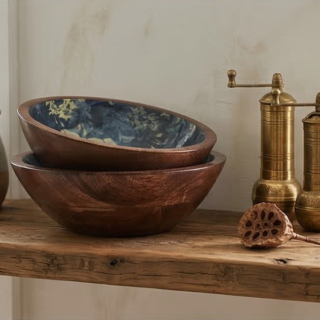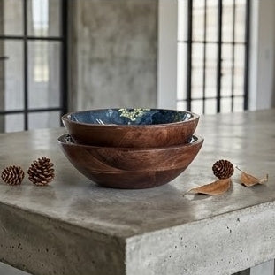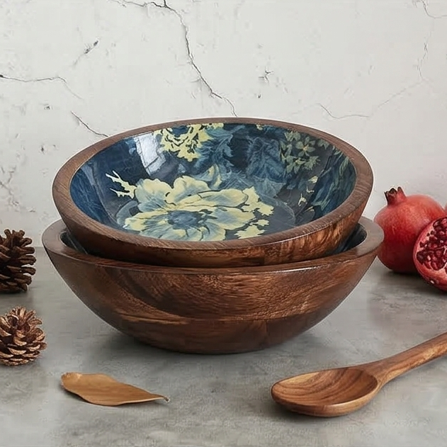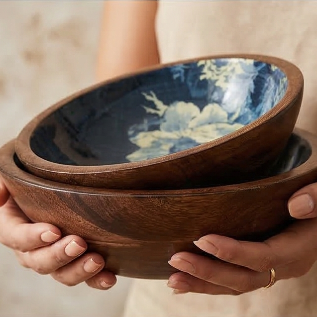 Product Description: Salads, fruits, nuts and even popcorn or wafers look amazing in these show-stopping wooden bowls. Showcasing the beautiful grain of natural mango wood, each organically shaped bowl is given a contemporary print for a modern twist. The bowl will highlight your table setting and dazzle your guests.