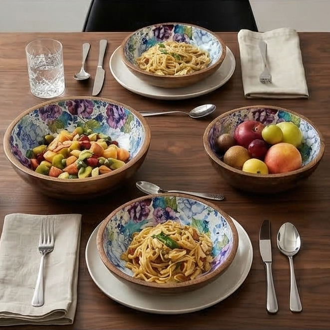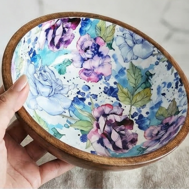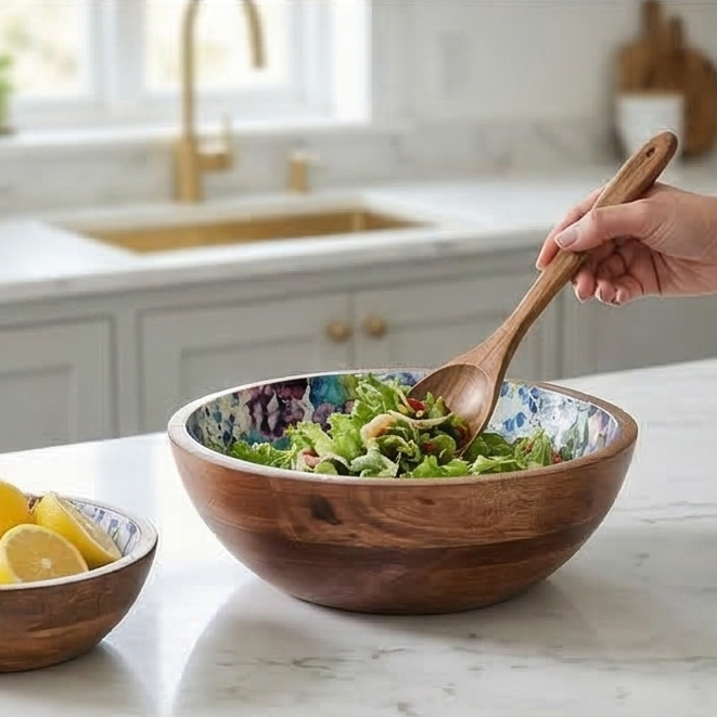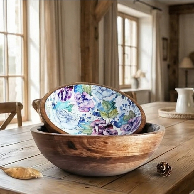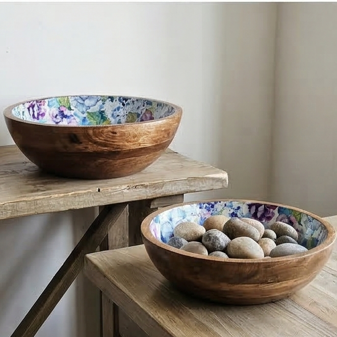 Salads, fruits, nuts and even popcorn or wafers look amazing in these show-stopping wooden bowls. Showcasing the beautiful grain of natural mango wood, each organically shaped bowl is given a contemporary print for a modern twist. The bowl will highlight your table setting and dazzle your guests.
