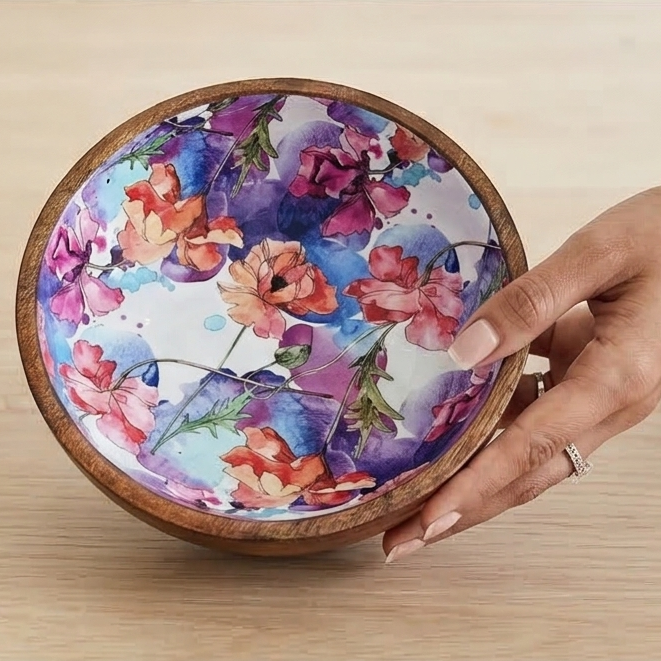 Salads, fruits, nuts and even popcorn or wafers look amazing in these show-stopping wooden bowls. Showcasing the beautiful grain of natural mango wood, each organically shaped bowl is given a contemporary print for a modern twist. The bowl will highlight your table setting and dazzle your guests.