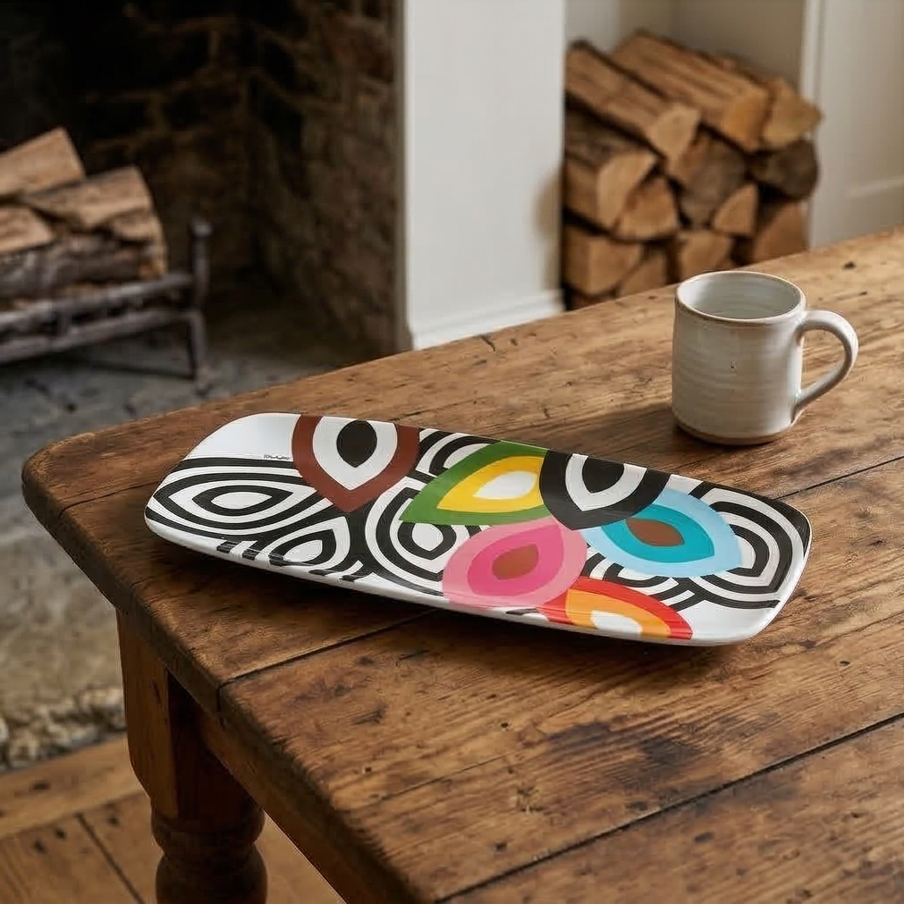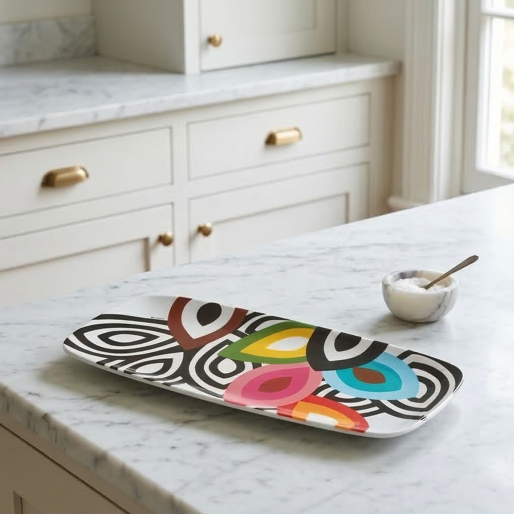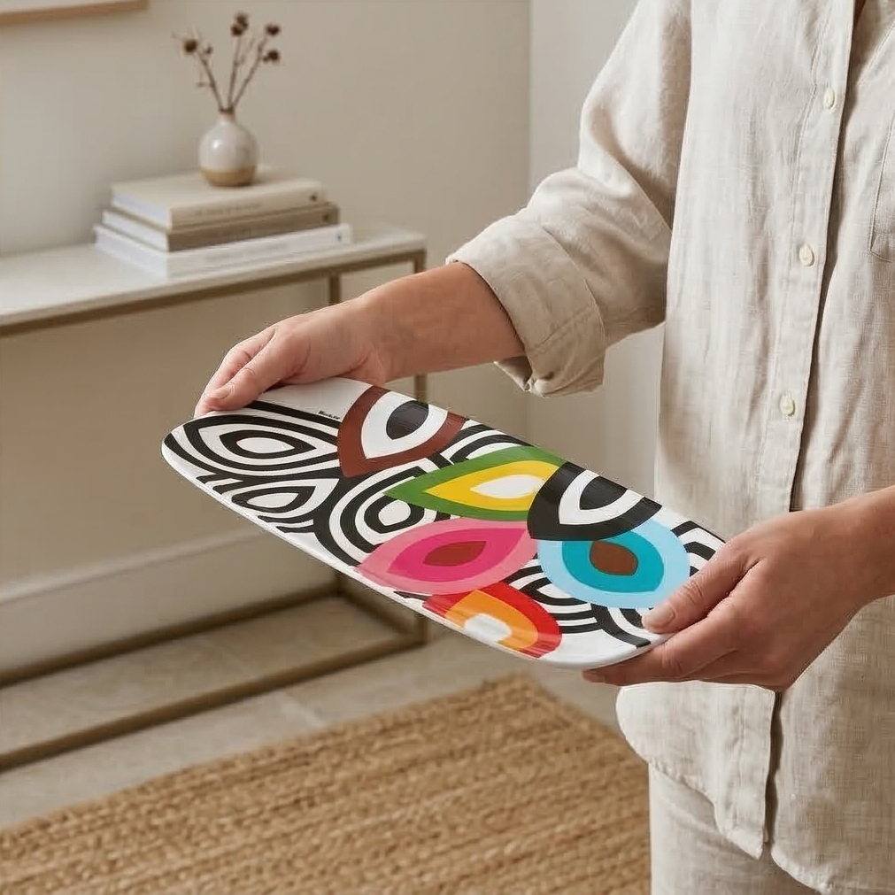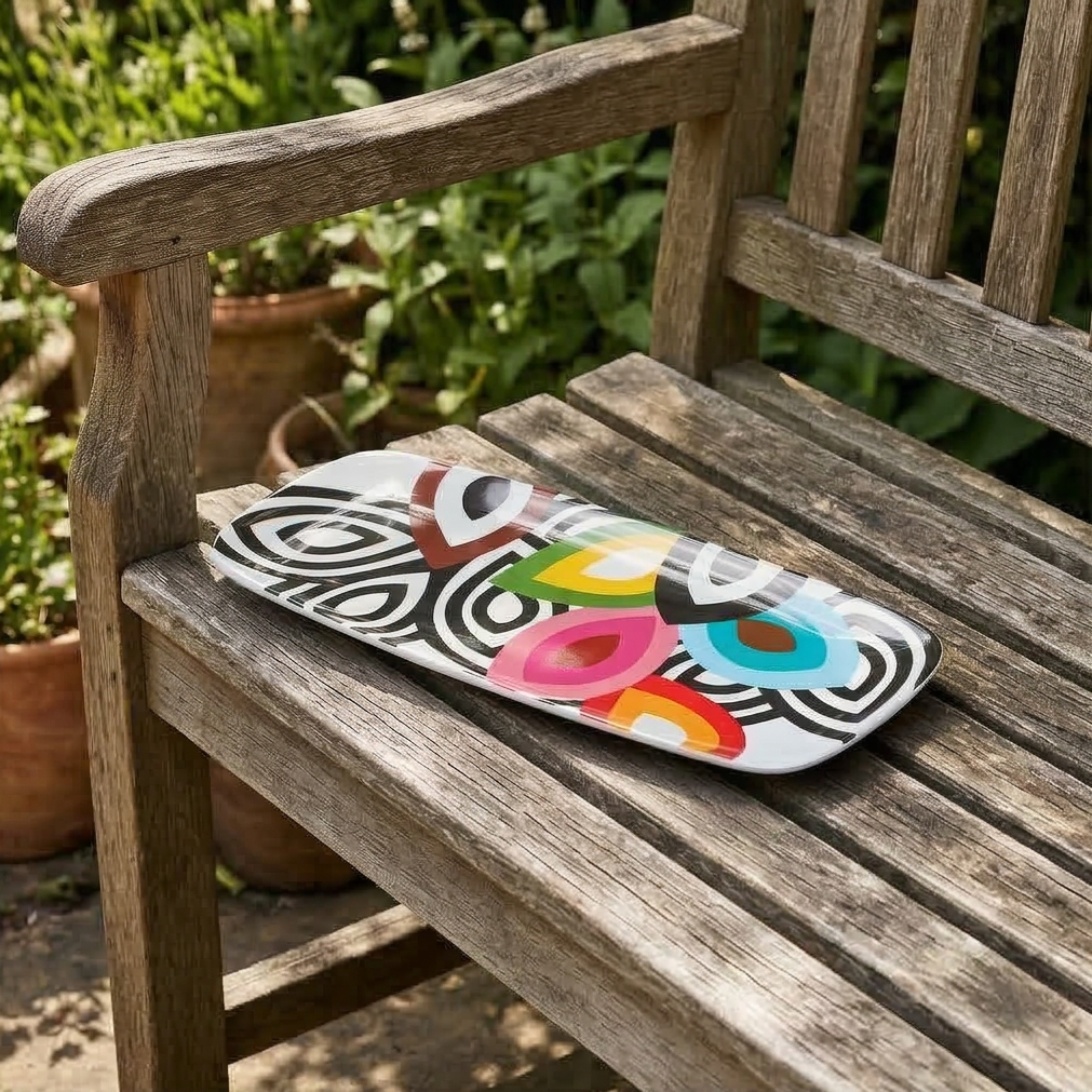 A long sleek coupe-style serving platter for indoor & outdoor meals, entertaining, picnics and barbecues. All platters coordinate with our plates to make it easy to create a unique hostess, housewarming or wedding gift. Our platters won't chip or fade. LIVE VIVID!