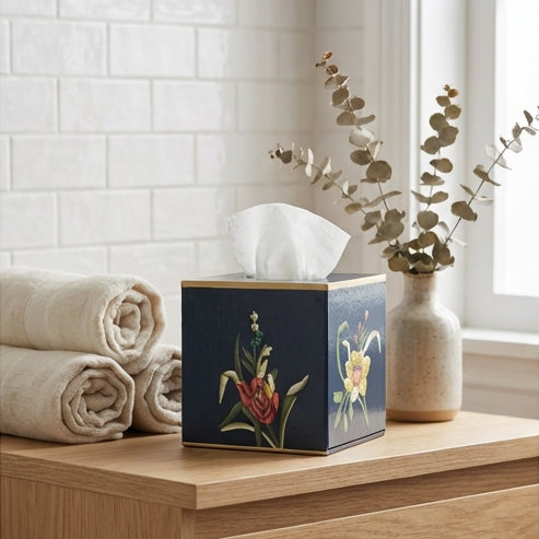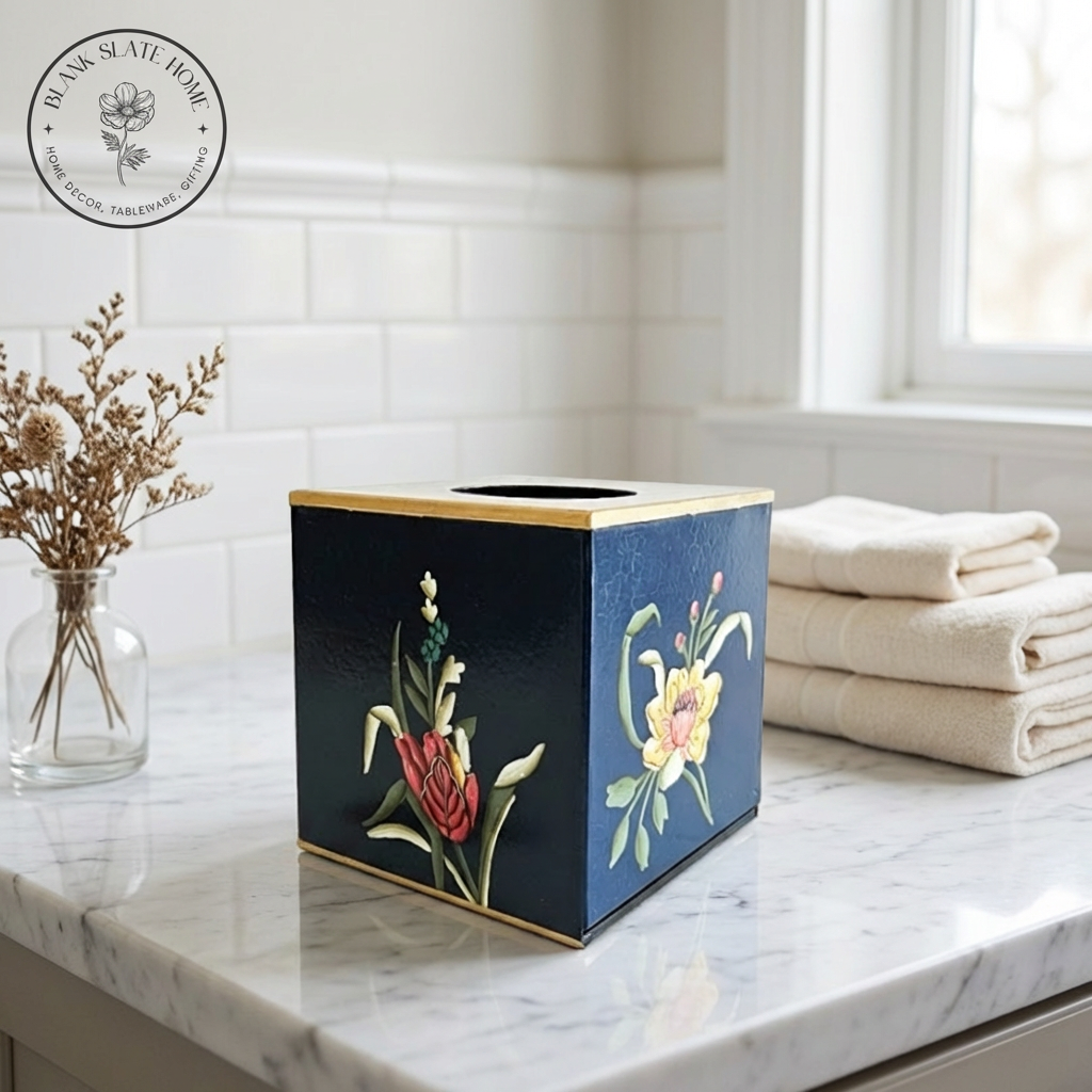 Add a touch of elegance to your home with this beautiful hand-painted tissue box holder. Made in durable metal, this tissue box adds colour and style to any corner of your home.