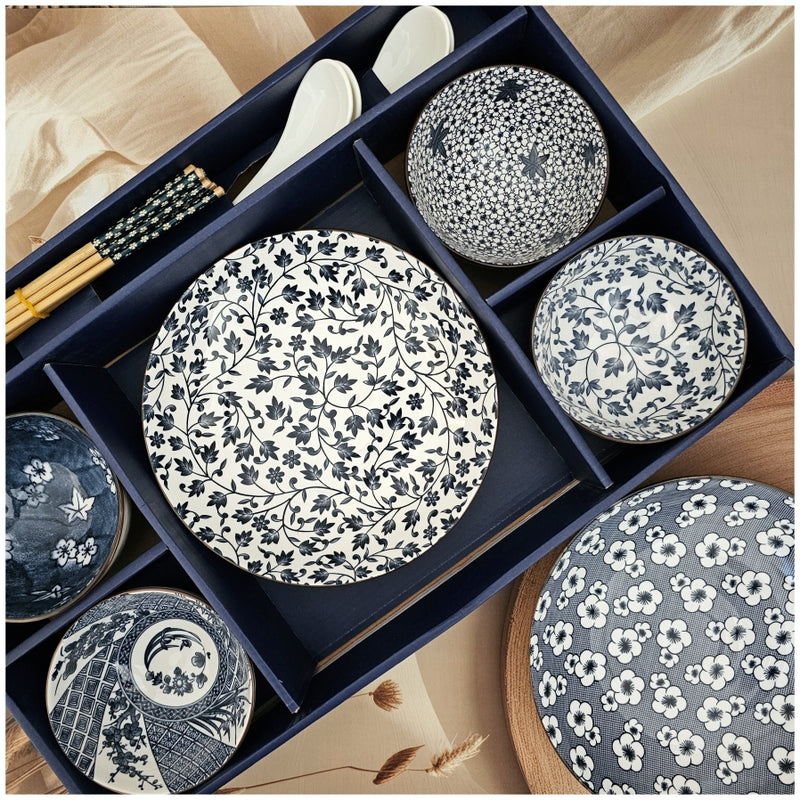 This Japanese inspired printed 4-bowl set with 2 matching platters along with 4 soup spoons and 4 sets of chopsticks in vibrant hues of blue is ideal for every day. Life's a party, but most days are pretty ordinary. Don’t wait for special occasions to take out your fancy dinnerware - instead, make every meal memorable. Our bowls simple & functional design is easy to coordinate with other colors and shapes - and makes them the perfect base for any type of cuisine. Make the most of everyday dining by serving up good food on our timeless dinnerware.